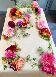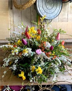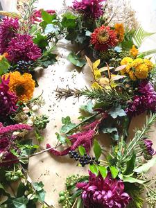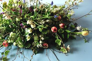 Ik gebruik geen plastic en steekschuim en alleen schone bloemen, veelal biologisch gecertificeerd. Alle bloemen kunnen op de composthoop en worden weer voedsel voor nieuwe bloemen.